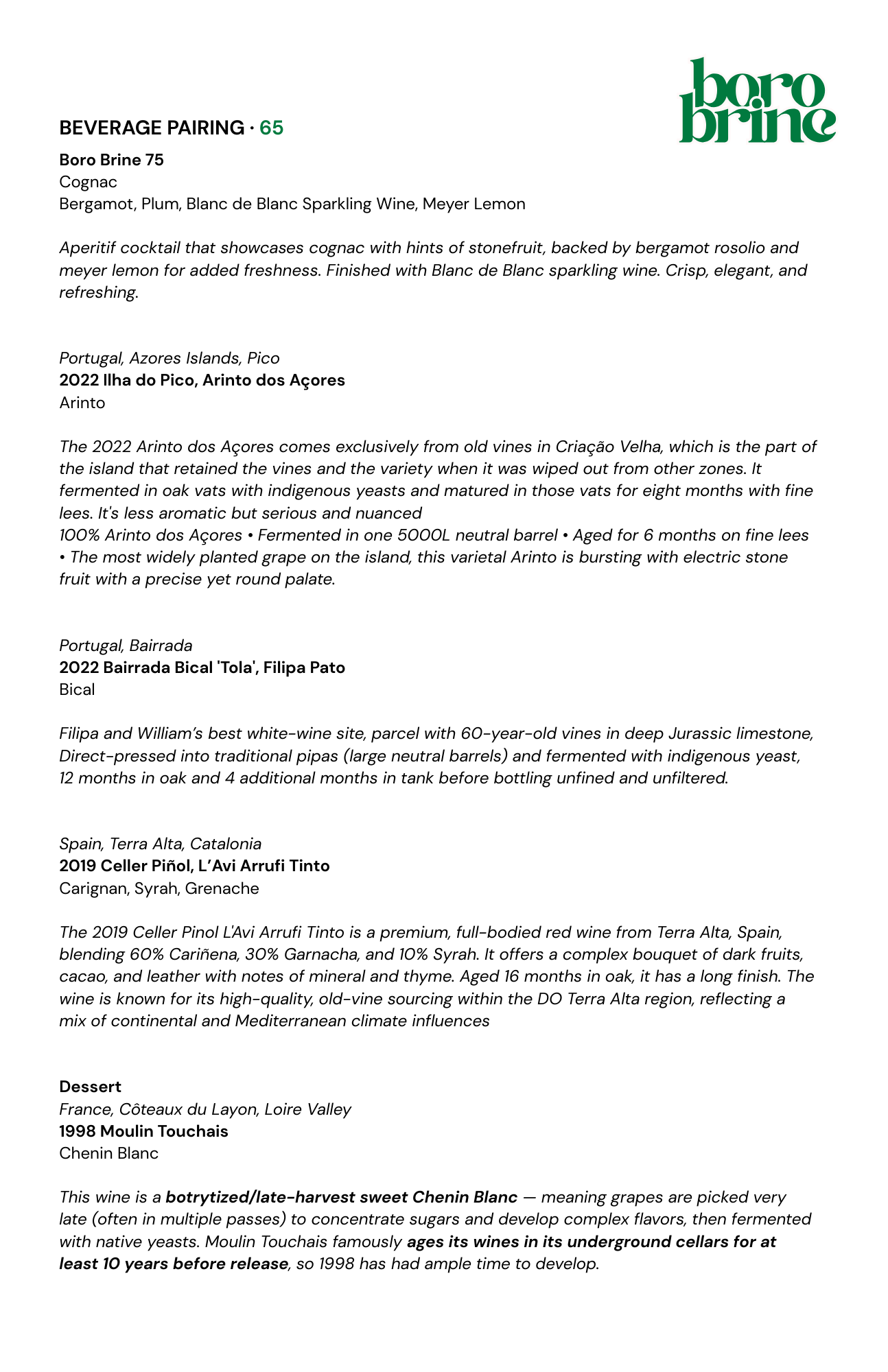 Our beverage pairing is crafted to complement the rhythm and flavors of the tasting menu. The pairing includes one cocktail and four wines, selected to balance brine, richness, acidity, and texture across the courses.